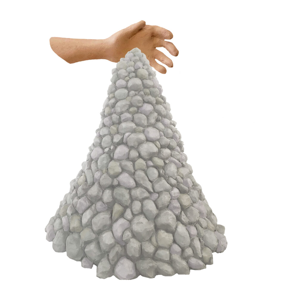 In der kubischen Andreaskirche – auch als Monolith bezeichnet – verweist die ortsspezifische Installation auf die kulturelle und spirituelle Bedeutung von Steinen. Steine in der Natur aufzustellen, gehört zu den ersten religiösen Handlungen der Menschheitsgeschichte. In der Plastik der Bildhauerin wird dies sichtbar; die Zeichnungen und Wandreliefs zeigen Arme und Hände, die Steine aufheben, umklammern, werfen: sie reflektieren den christlich – biblischen Bezug sowie den aktuell- politischen. Die Ausstellung wird kuratiert von Veronika Kuhn, Kunsthistorikerin.